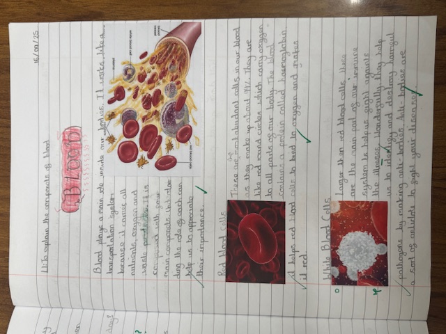 In Science, we have been learning about the Circulatory System. This week we specifically focused on the components of the blood. Children watched videos explaining the roles of each of the components and explained them in their books, using scientific terminology.