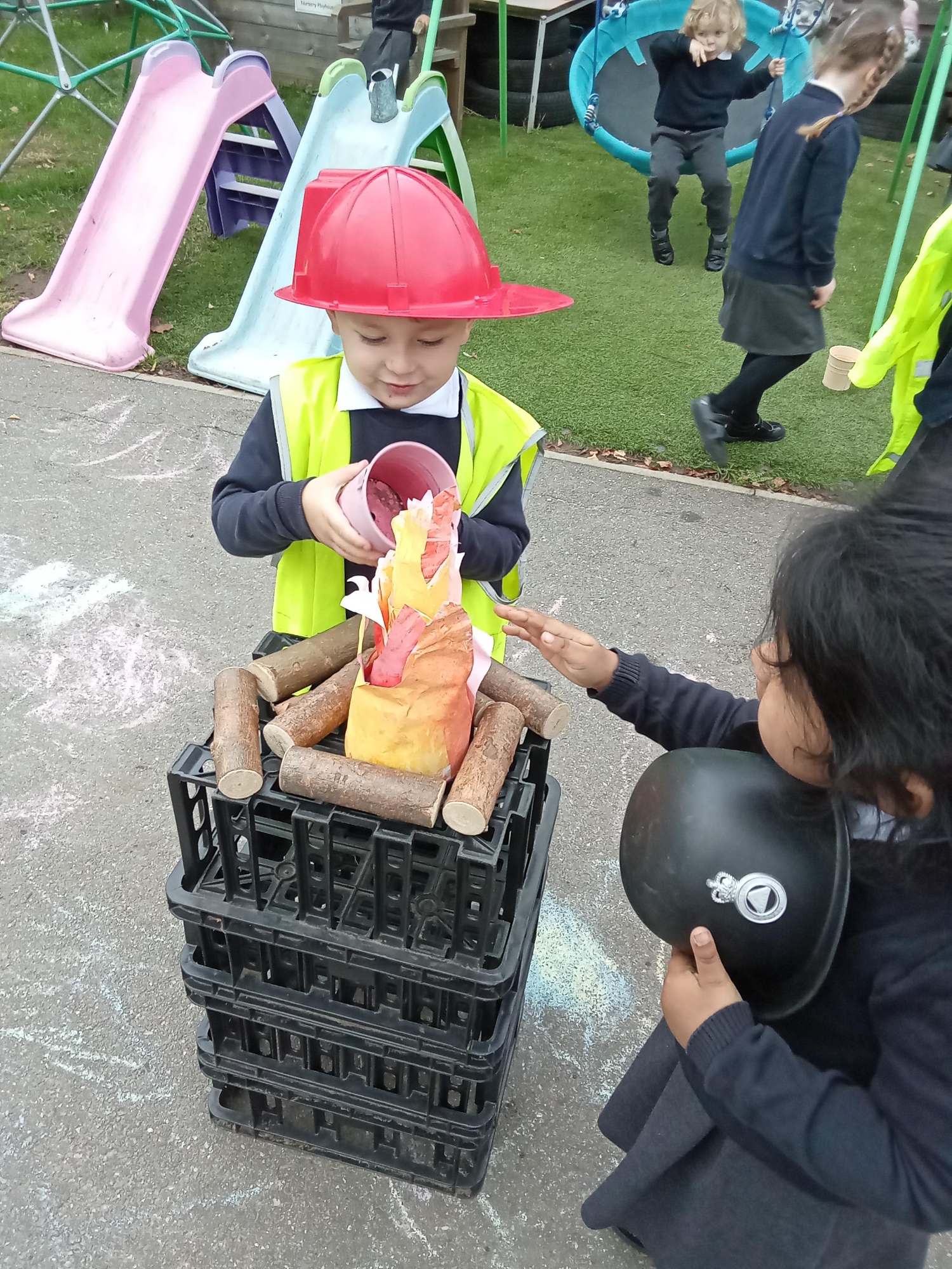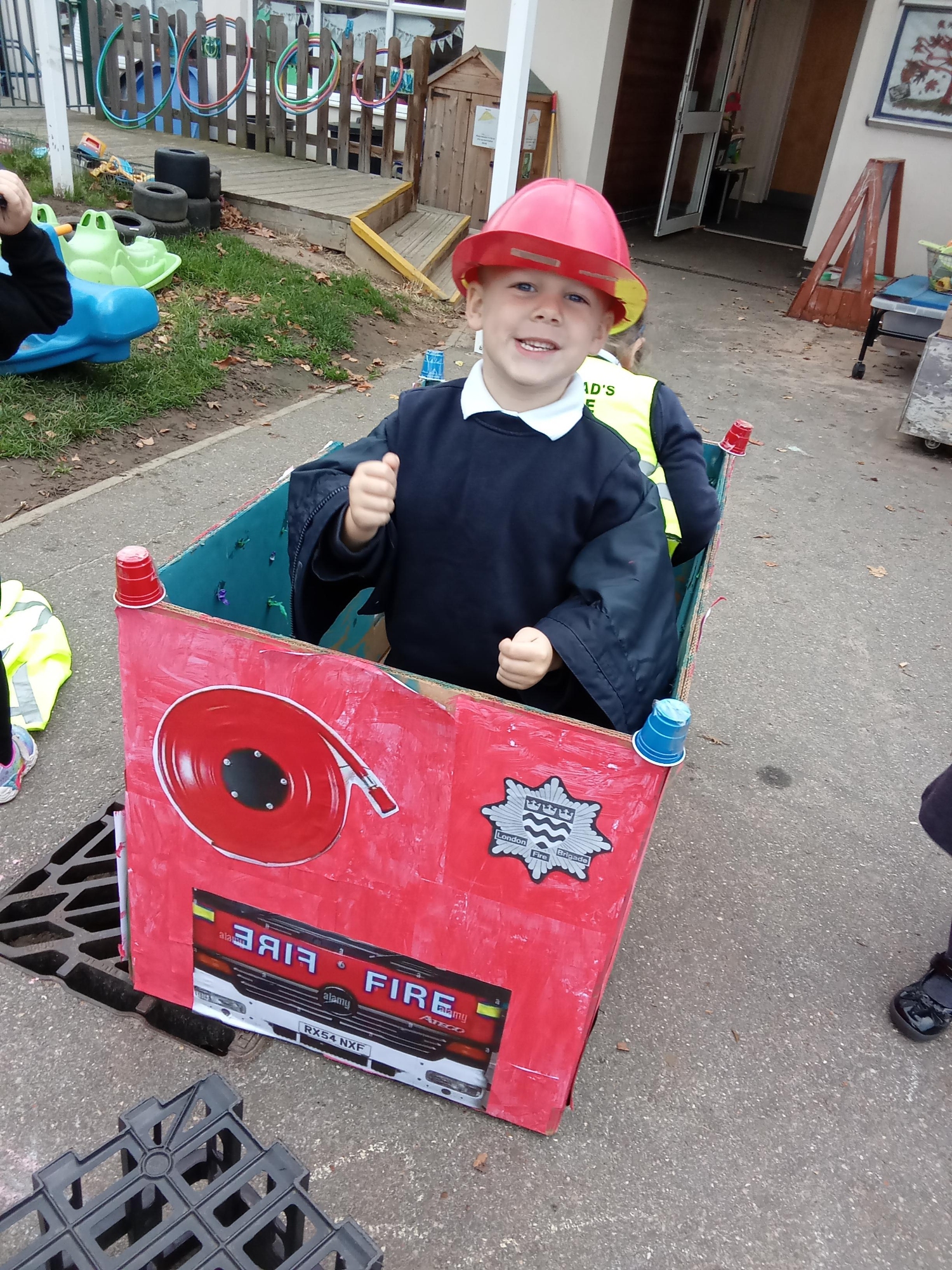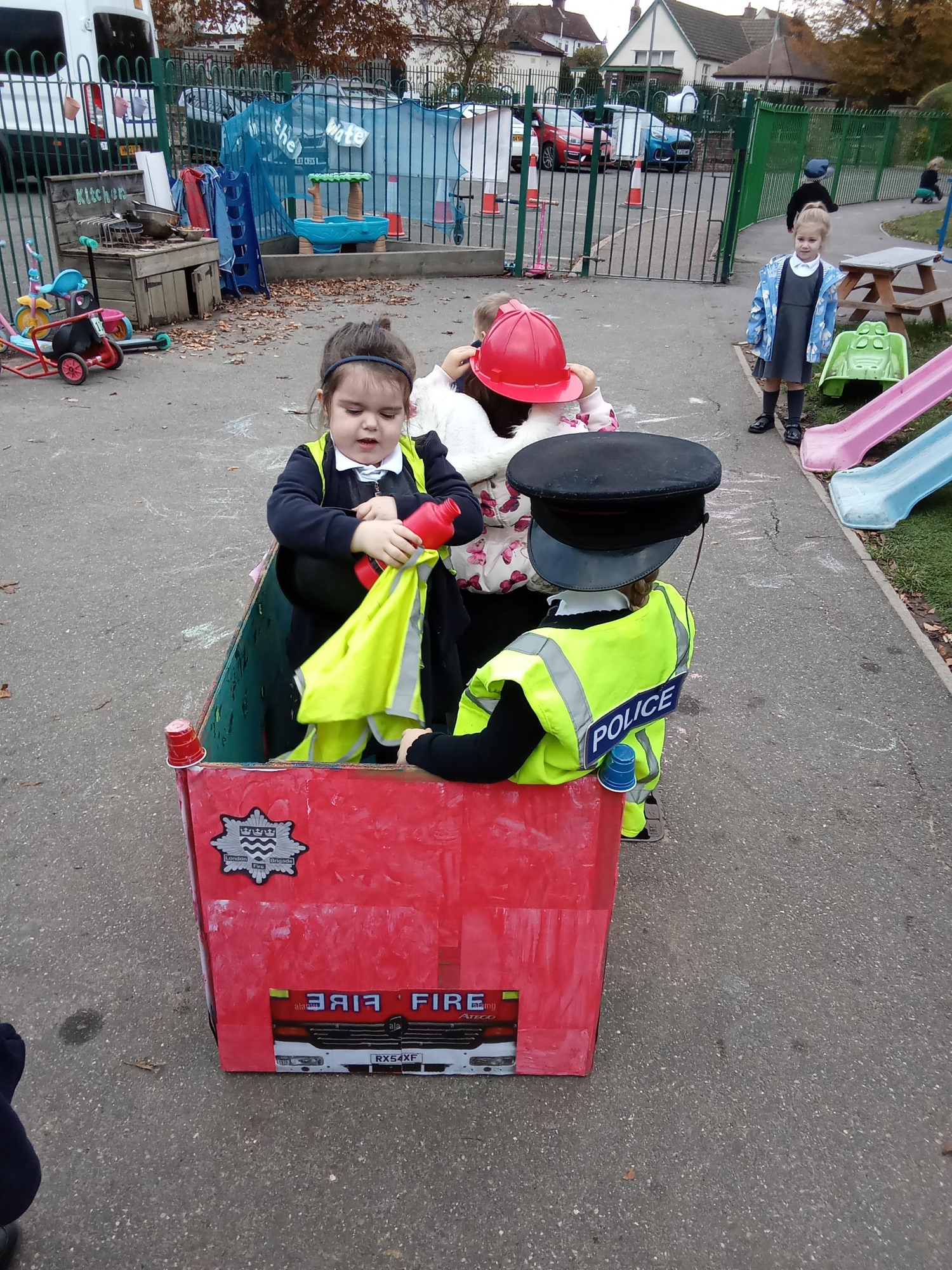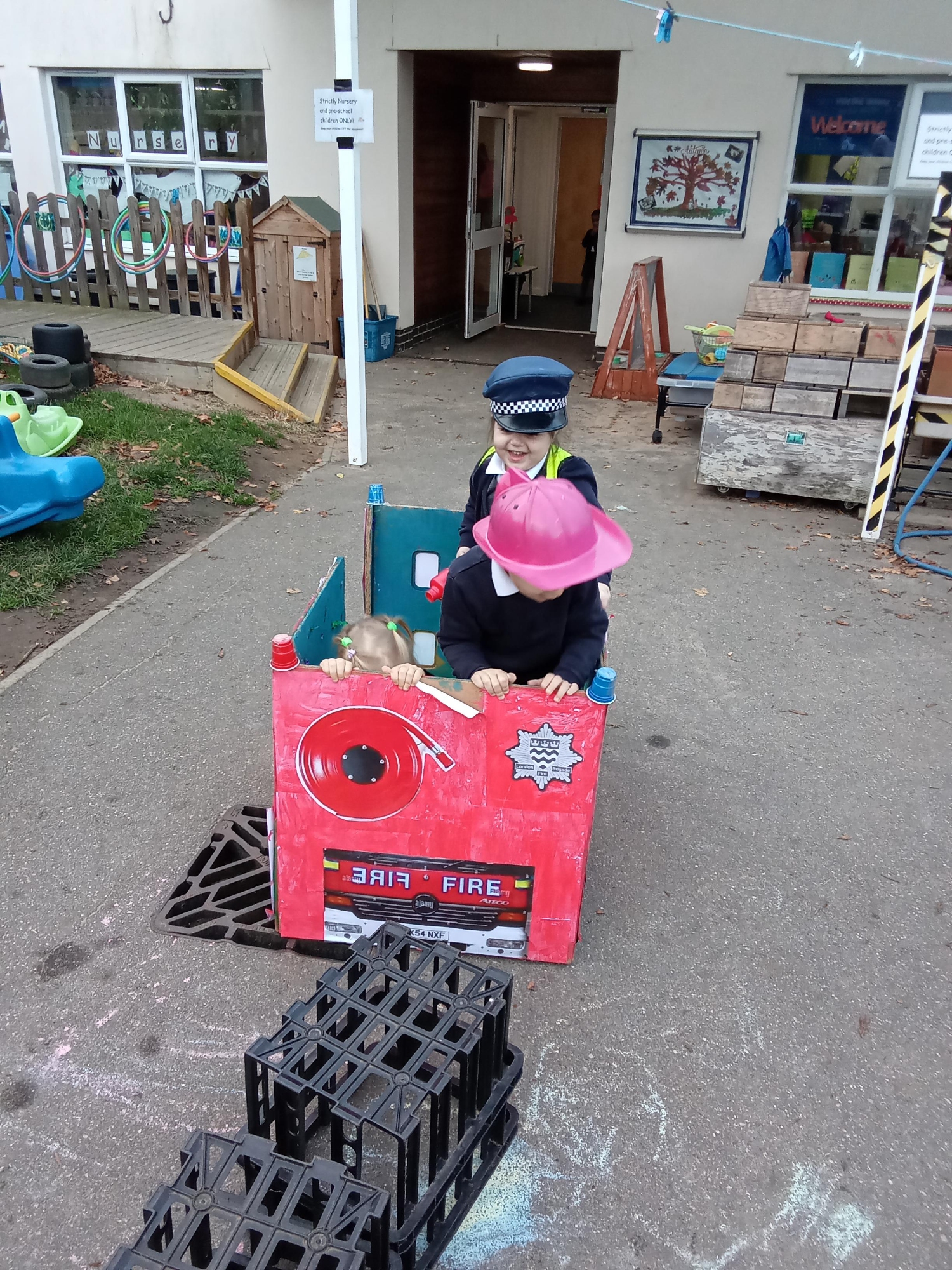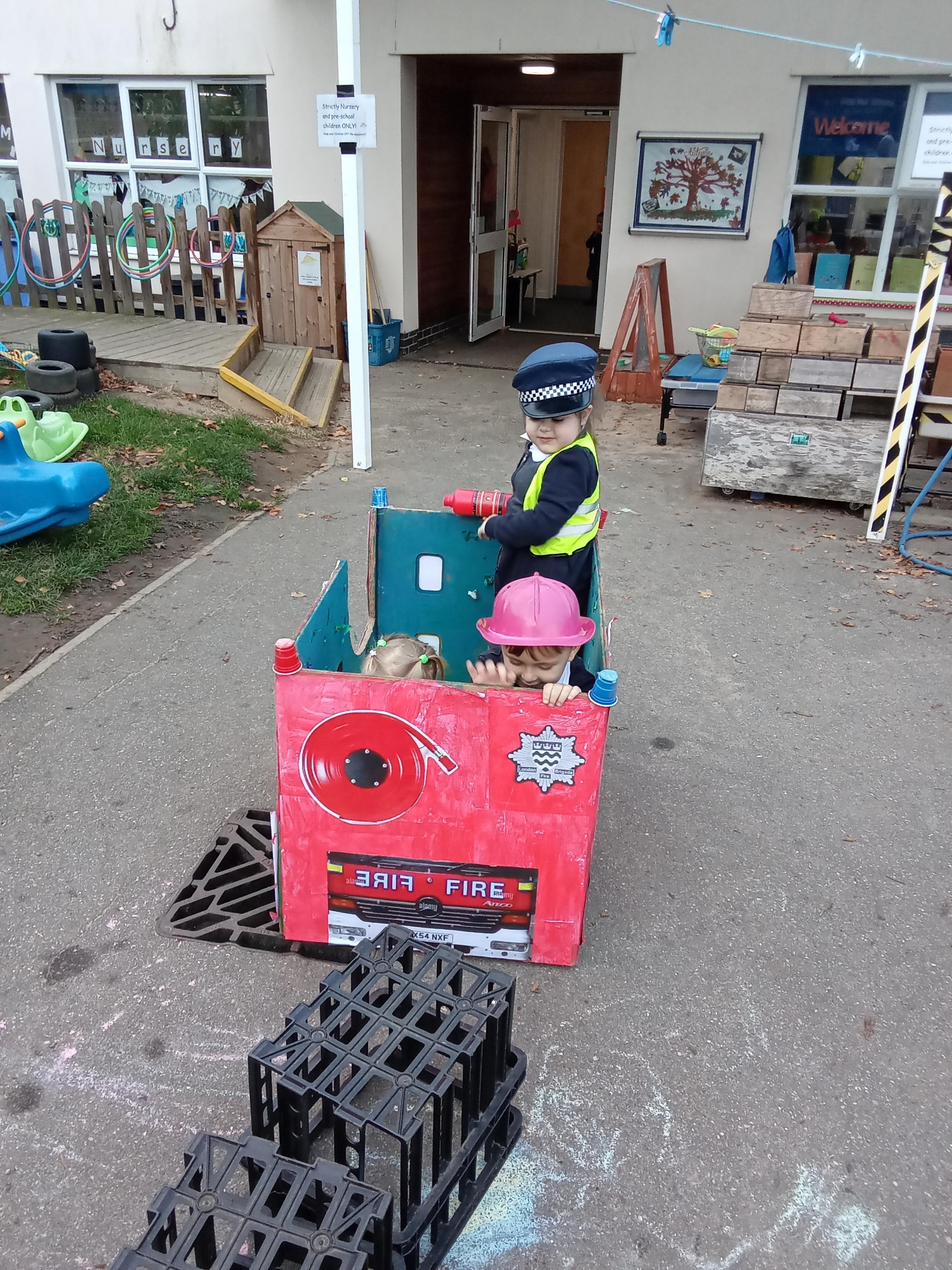 This term the children are learning about 'People that Help us' and what to do in an emergency. We have had lots of fun making a Fire engine to use in our role play; as you can see by the pictures, the children are having a great time! I am sure that many of the children are now coming home and telling you about the sounds we have been learning in class, we make the most of every opportunity to practise a new sound in Nursery; fff, fireworks, fire, flames and ppp, painting poppies for Remembrance Day, to name just a few.