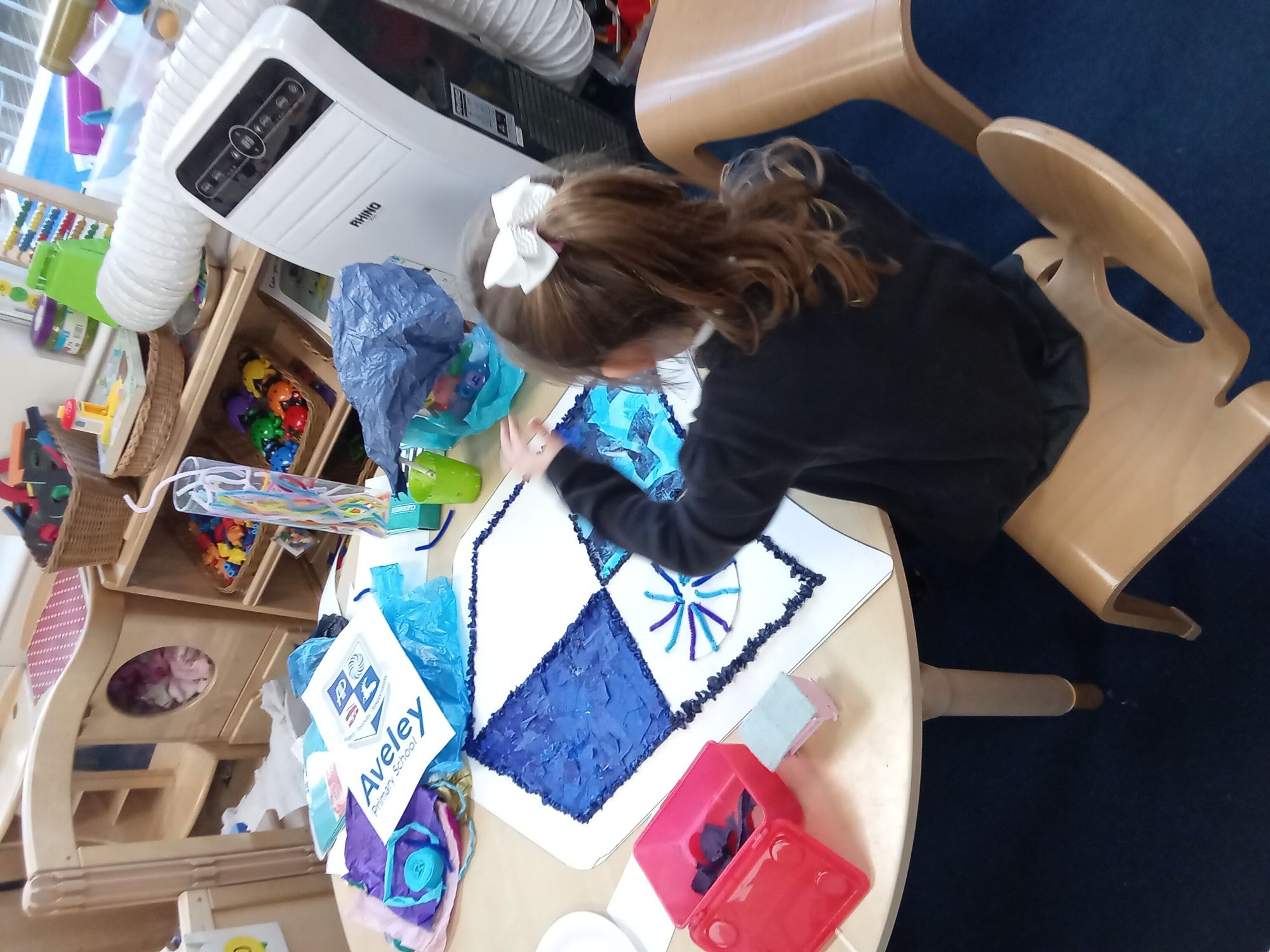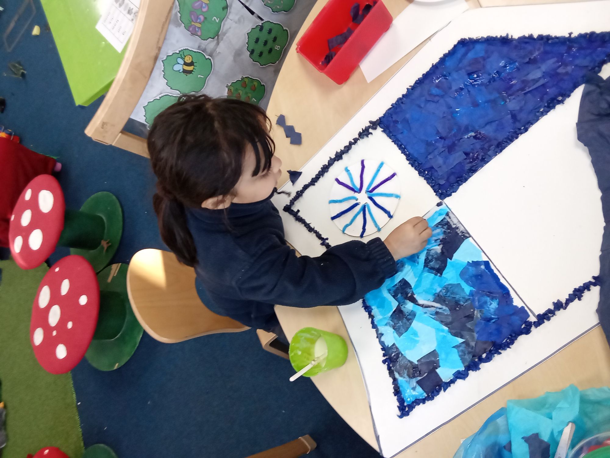 As an additional challenge, Nursery were tasked with creating a piece of artwork to be displayed in the reception foyer. We chose to create the new school emblem and it really did work our fine motor skills squeezing and rolling all that tissue paper.